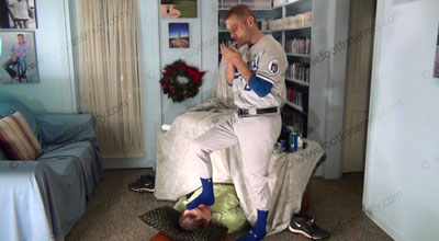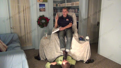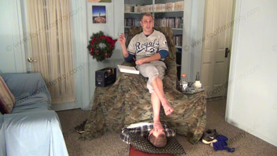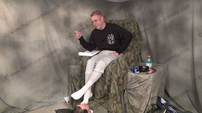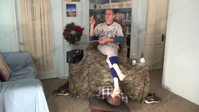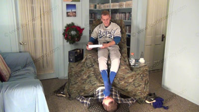 He is above his sissy slave who must worship his dirty baseball socks & stirrups. These three views are of Jock Riley - In uniform with feet in the sissy’s face for worship as he is sitting over his slave, trample & stepping on his face while standing, having socked, jock feet sniffed, licked, kissed & worshiped, he tells how it feels to get slaves to need his feet while his slave is on the floor beneath ....... (click video link to see full description)
