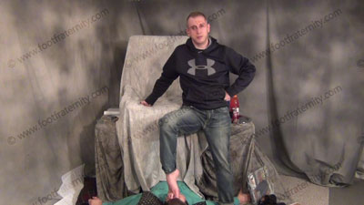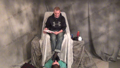 These three views are of Riley - In jeans, & hoodie, sheer socks in the sissy’s face for worship as he controls him to need to serve these feet. He is lounging above the sissy comfortably as his foot bitch who is humiliating himself on the floor beneath his feet; while Riley is having his socked & bare feet sniffed, licked, kissed & worshiped. His foot bitch is humiliating himself on the floor beneath his....... (click video link to see full description)
