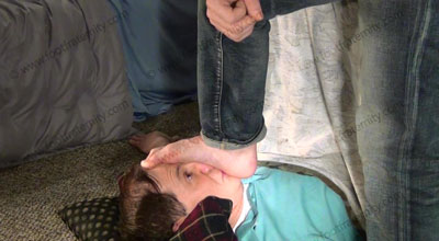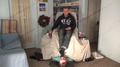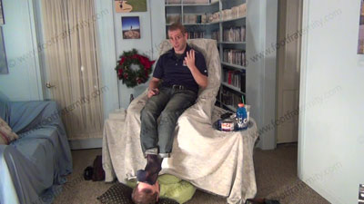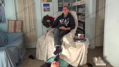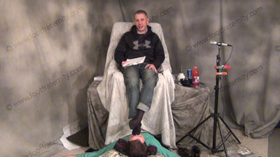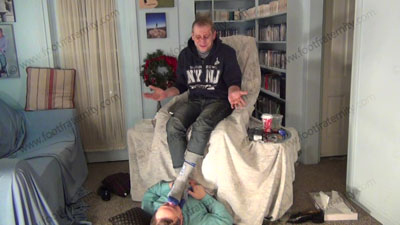 These three views are of Riley - In jeans, hoodie, black thick & thin sheer socks in the sissy’s face for worship as he controls him to need to serve these socked feet. He is sitting over his slave comfortably as his foot bitch who is humiliating himself on the floor at his feet; while Riley is having his socked & bare feet sniffed, licked, kissed & worshiped. Then Riley stands up to step on the sissy’s....... (click video link to see full description)