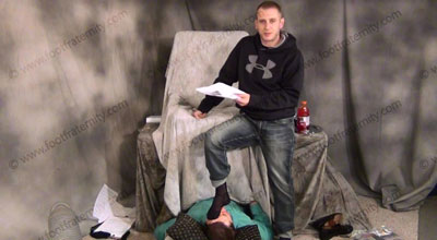 Did you ever get teased in gym class in high school? Well Riley did the teasing to foot slaves & now he is a famous coach who makes wimps PAY to be his foot bitches! He is on the air answering questions from his listeners about this phenomenon. These three views are of Coach Riley - In jeans, Under Armor hoodie, loafers and sheer socks in the sissy’s face for worship as he is sitting over his slave at the....... (click video link to see full description)