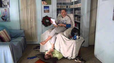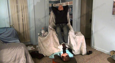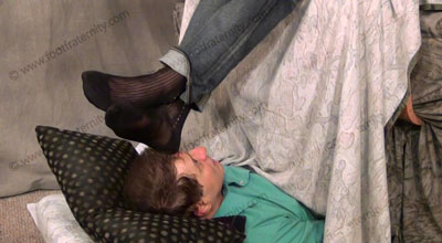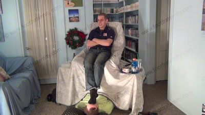 These three views are of Riley - In jeans, & sports shirt, sheer socks in the sissy’s face for worship as he controls him to need to serve these feet. He is lounging above the sissy comfortably as his foot bitch who is humiliating himself on the floor beneath his feet; while Riley is having his socked & bare feet sniffed, licked, kissed & worshiped. This Jock talks about slave’s service to his feet! He ....... (click video link to see full description)