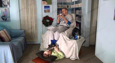 He is on the table above his sissy slave who must smell & worship his dirty blue baseball socks & stirrups then his bare feet. These three views are of Jock Riley - In uniform with feet in the sissy’s face for worship as he is sitting over his slave, having socked & bare jock feet sniffed, licked, kissed & worshiped, he relaxes as this worship is administered! He teases and mocks his foot slave who is und....... (click video link to see full description)