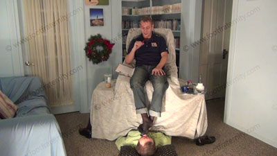 These three views are of Riley - In jeans, pull over shirt, back thin dress socks in the sissy’s face for worship as he controls him to need to serve bare & socked feet. He is sitting over his slave comfortably as his foot bitch who is humiliating himself on the floor at his feet; while Riley is having his socked sniffed, licked, kissed & worshiped as he informs all of the laws (The 27th Amendment) of ser....... (click video link to see full description)