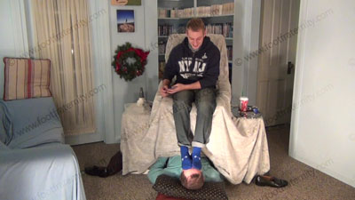 These three views are of Riley - In jeans, & hoodie, Under Armor royal blue socks in the sissy’s face for worship as he controls him to need to serve these feet. He is lounging above the sissy comfortably as his foot bitch who is humiliating himself on the floor beneath his feet; while Riley is having his socked & bare feet sniffed, licked, kissed & worshiped. His foot bitch is humiliating himself on the ....... (click video link to see full description)