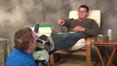 In jeans, white with color gym socks, Graham is laughing and sitting back with his slave at his foot stool. Sissy serves his feet to be totally embarrassed and humiliated as he torments and teases and mocks his slave! Slave is kissing the socked feet, adoring socked toes and feet, smelling them, worshiping the straight stud's socked feet, then bare foot action and forcing slave to humiliate himself with bar....... (click video link to see full description)