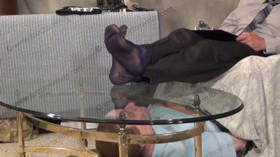 Dr. Gridiron is given an award on the air! In slacks, shirt, tie and thin sheer dark dress socks and loafers, Dr. Gridiron thanks the audience for this honor. He takes questions from his listeners while on the air and while having a slave at his socked feet from beneath a glass top table. Slave can only see the feet that Graham his resting on the glass table and the sissy can’t even get to kiss or worship....... (click video link to see full description)
