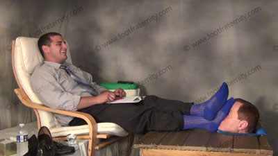 Dr. Gridiron had a doctorate in Psychology so he decided to open an office to counsel sissys who need straight guy’s feet! (He secretly makes them need it more when they are in his therapy session.) In shirt and tie, loafers, sweaty royal blue thick and thin dress socks, Dr. Graham has his patient locked in sweat box table with only his head available for the Dr. to relax and shove his socked feet in that....... (click video link to see full description)