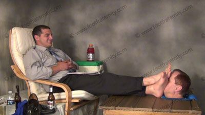Dr. Gridiron had a doctorate in Psychology so he decided to open an office to counsel sissys who need straight guy’s feet! (He secretly makes them need it more when they are in his therapy session.) In shirt and tie, loafers, sweaty gold toe dark dress socks, Dr. Graham has his patient locked in sweat box table with only his head available for the Dr. to relax and shove his feet in that face. He gives his....... (click video link to see full description)