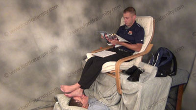 Wearing casual shirt, nice slacks and his sweaty sheer thick & thin socks, these three views (one close up) are of this Macho Jock Str8 Stud having his socked & bare feet sniffed, worshiped & served, as he ignores slave while reading his sports magazines. Slave is on the floor beneath his Master’s sweaty socked feet. He teases and mocks his foot slave orders socked foot worship, then relaxes to the humiliation of the helpless foot slave. Riley knows he deserves this worship!