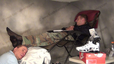 Dressed in a hoodie & camouflage pants & wearing various sox; Master Riley has his slave kneeling to serve his feet in these close up only scenes from the above films on a different angle. Extremely Exciting to see it so very close up!