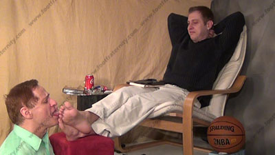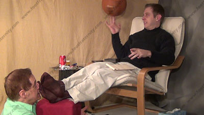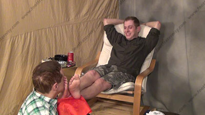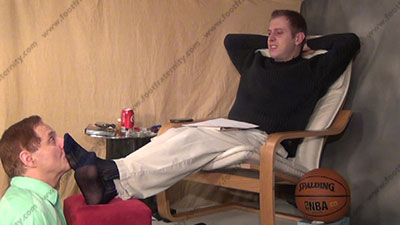 These views are from other cameras of close ups from more of his previous films, of this Cocky, Jock sitting above his slave who is on the floor to worship his feet. Riley is teasing his slave about his need to worship Str8 feet and socks & bare feet action while he teases and mocks his foot slave who is beneath his feet. He orders foot worship, torments slave; socked foot & bare foot adoration and mocking & humiliation the foot slave sissy.