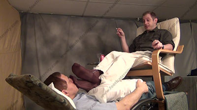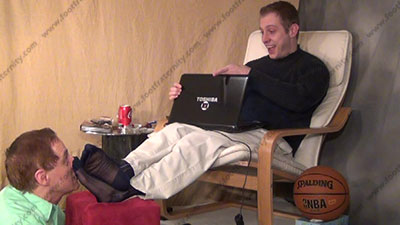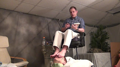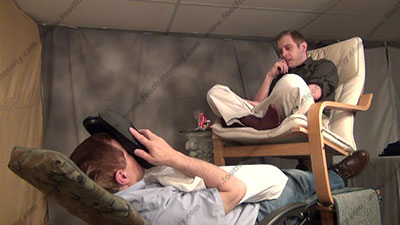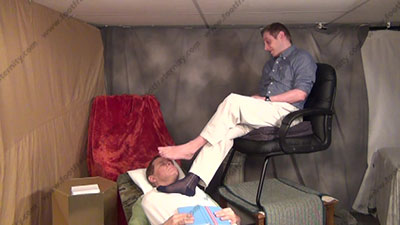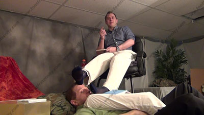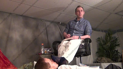 These views are from other cameras of close ups from his films 8644-8645-8646, of this Cocky, Therapist is teasing his slave about his need to worship the Dr.’s feet and socks sniffed & bare feet action while he teases and mocks his foot slave who is lying at his feet. He orders foot worship, torments slave; socked foot & bare foot adoration and mocking & humiliation the helpless foot slave.