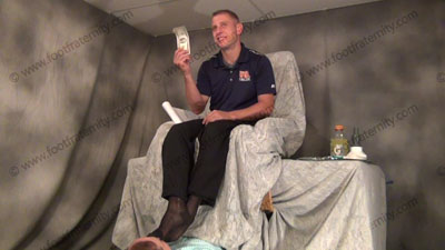 Dressed casually, in his sweaty sheer socks, these three views are of this Macho athletic Therapist having his socks sniffed & worshiped, while he answers more questions about how he uses his therapy on his slave to make us NEED his feet all the more! He teases and mocks his foot slave who is lying on the floor beneath the Doctor’s feet while worshiping his socks. Riley teases about how to put slaves in o....... (click video link to see full description)