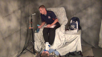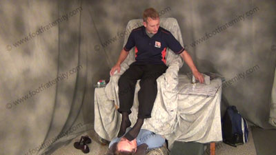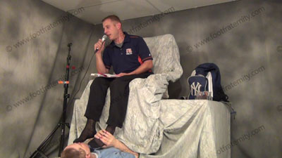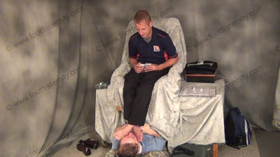 These views are from other cameras of close ups from 8652-8653-8654, of this Cocky, Jock Coach, sitting above his slave who is on the floor to worship his feet. Riley is teasing his slave about his need to worship Str8 feet and socks & bare feet action while he teases and mocks his foot slave who is beneath his feet. He orders foot worship, torments slave; socked foot & bare foot adoration and mocking & humiliation the foot slave sissy.