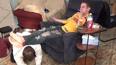 In slacks, dress shirt, and the black dress socks that he wore when he got married, this hot straight stud teases his slave for going out to get him a pizza to eat while slave is serving at his feet. He likes to tease with his feet and hold them in the slave's face as he lays on the sofa with the sissy kneeling at his feet. He laughs that he has this power to make us serve him a fresh pizza while serving hi....... (click video link to see full description)