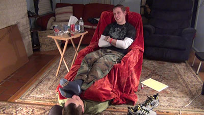 In Air Force pants, sweaty grey work socks with blue cap toe, and sweatshirt as this hot straight stud ignores his foot slave as he plays video games while his slave is serving at his feet. He likes to tease with his socked feet and hold them in the slave's face and ignore him while he is playing the games! He loves this idea to make our place under a straight guy's feet as he relaxes. Riley is sitting on h....... (click video link to see full description)