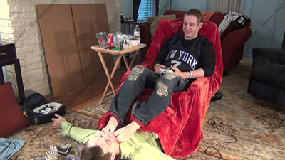 In jeans and sweatshirt as this hot straight stud ignores his foot slave as he plays video games while his slave is serving at his bare feet. He likes to tease with his sweaty bare feet and hold them in the slave's face and ignore him while he is playing the games! He loves this idea to make our place under a straight guy's feet as he relaxes. Riley is sitting on his easy chair with his slave on the floor u....... (click video link to see full description)