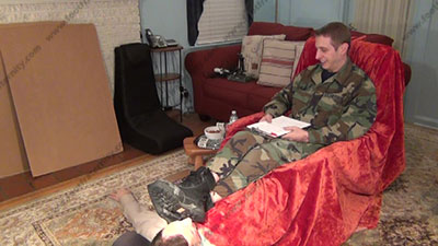 In full Air Force uniform, Riley has his "on fire" white flamed work out socks with red toes, worshipped & sniffed and kissed while he humiliates his slave, telling of the truth of the sissy's need to worship & serve a Straight Military Guy's feet; then sweaty bare foot service, Sgt. Riley teases him, forcing him to serve his sweaty socks, then his perfect bare feet, lick 'em, clean between toes and more; H....... (click video link to see full description)