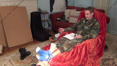 In uniform, sweaty royal blue socks with white cap toes & heels, black lace up boots, as this hot straight stud teases his foot slave as he watches & laughs while his slave is licking his boots for a while ,then socked then bare feet as he uses his joy stick to play a military drill game. He likes to tease with his sweaty feet & bare feet and hold them in the slave's face and tease him while his slave is se....... (click video link to see full description)