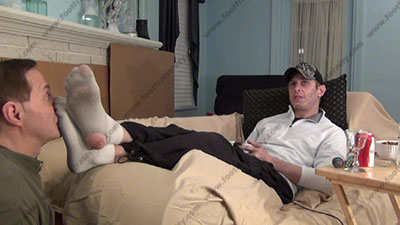 In cargo pants, sweatshirt, sweaty white Puma gym socks as this hot straight stud ignores his foot slave as he plays video games while his slave is serving at his feet. He likes to tease with his sweaty socked & bare feet and he lays on the sofa with slave kneeling at this feet for worship! He loves this idea to make our place under a straight guy's feet as he relaxes. He intently plays this games making ma....... (click video link to see full description)