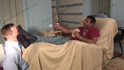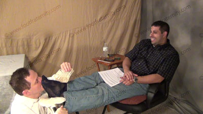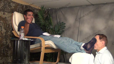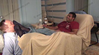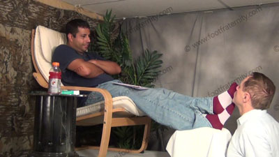 In jeans, polo shirt & blue sheer socks, this hot guy is sitting above his slave in his easy chair with slave kneeling on the floor at his feet while worshipping & sniffing the sweaty socked feet then the sweaty bare feet, as Roberto reads his more fan mail and humiliates the guys who wrote in with their darkest secrets about being his foot slave; Roberto humiliates his slave & the other sissys ready to be ....... (click video link to see full description)