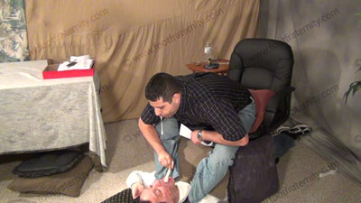 In jeans, sneakers, sweaty gold toe socks, then much bare feet for worship; Roberto sitting high above the cop slave who is bound spread eagled to the bed as Roberto tells his 18 year old son that this cop will now be HIS slave as well! Roberto teaches his son how to have foot worship; spit; teases; mocks; gives orders; and commands the cop to serve him, and his son now; then he takes a dildo and makes the....... (click video link to see full description)