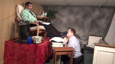 In dress shirt, tie, wing tips & thin blue sheer to toe nylon socks, this hot straight stud is sitting in easy chair on the altar with his slave kneeling at his socked & bare feet while Roberto talks rules as the God of the church while his sissy serves at his sweaty feet; Roberto commands him, knowing that he rules & humiliates slave at his feet ready to be totally embarrassed by allowing him to serve his ....... (click video link to see full description)