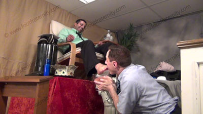 In dress shirt, tie, wing tips & thin blue sheer to toe nylon socks, this hot straight stud is sitting in easy chair on the altar with his slave kneeling at his socked & bare feet while Roberto rules as the God of the church while his sissy serves at his sweaty feet; Roberto commands him, knowing that he rules & humiliates slave at his feet ready to be totally embarrassed by allowing him to serve his God; t....... (click video link to see full description)