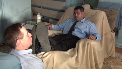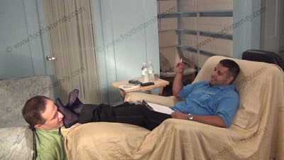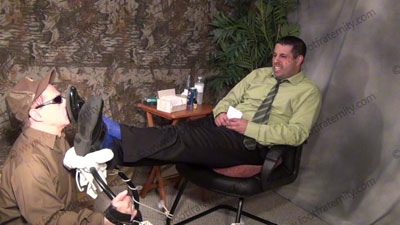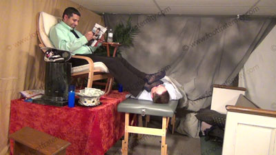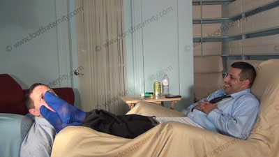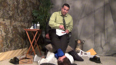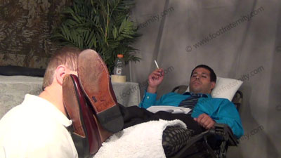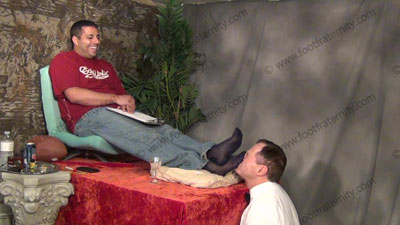 In dress pants, shirt & tie, Roberto is reading his Playboy magazine as slave must shave the hair from his macho feet. The slave must put the blue sheer to toe dress socks on his feet for worship as he continues to read; Roberto sitting in easy chair on riser high above, with slave kneeling at his feet as he just sits back and relaxes as he does whatever he wants as love making is done to his socked and the....... (click video link to see full description)