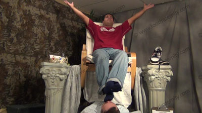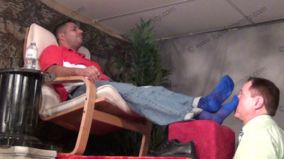 In jeans, shirt, burgundy Under Armor football socks Roberto sitting in easy chair on riser high above, with slave kneeling at his feet as he teases; mocks; gives orders; and commands the bitch to serve him as he reads a very humiliating letter from a priest who is begging to serve Roberto as a god; he humiliates the sissys as the slave kneels before his sweaty socked feet; then he does bare foot action in ....... (click video link to see full description)