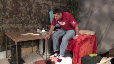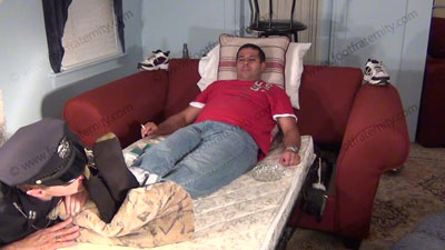 In jeans, sneakers, sweaty gold toe socks, for worship; Roberto sitting high above the cop slave who is bound spread eagled to the bed as Roberto tells his 18 year old son that this cop will now be HIS slave as well! Roberto teaches his son how to have socked foot worship; spit; teases; mocks; gives orders; and commands the cop to serve him, his brother and his son now; then takes slave's gifts for allowin....... (click video link to see full description)