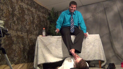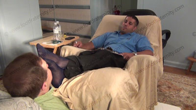 In slacks, black tassel loafers, blue sheer to toe dress socks for worship; Roberto sitting in lounger as he tells his 18 year old son that this foot sissys will now be the son's slaves as well! Roberto teaches his son how to have foot worship; teases; mocks; gives orders; and commands the bitch to serve him, and his son now; he humiliates the sissy as he shows his son how to dominate and humiliate a foot ....... (click video link to see full description)