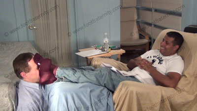 In jeans, sneakers, Red T shirt, & burgundy Under Armor football sweaty socks, Roberto has slave beneath his feet as he sits over the slave, dangling his feet in the sissy's face for service; worshipping & sniffing the sweaty socks, then the sweaty macho, meaty bare feet as Roberto reads the new Constitution of NO RIGHTS for Gay Men who MUST NOW be slaves to SRAIGHT MEN by law! HE finds this really amusing ....... (click video link to see full description)