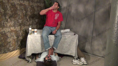 In jeans, T-shirt & VERY MUDDY and grass filled football cleats, this hot straight stud is on the dining table with the sissy in a tuxedo, kneeling on the floor at his feet, ready to lick the mud and grass off of the cleats of his Macho master before the slave renewal vows to his feet. Roberto made water sports ice cubes and feeds them to the slave in his wine glass with spit & more! He mocks him, takes pho....... (click video link to see full description)