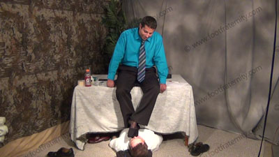In dress pants, shirt & tie, blue sheer to toe dress socks for worship, then bare foot worship & service for half of the scene; Roberto sitting in easy chair on riser high above, with slave kneeling at his feet as he teases; mocks; gives orders; and commands the bitch to serve him; he humiliates the sissy as the slave kneels before his sweaty feet; he totally teases & mocks with his feet for real as he just....... (click video link to see full description)