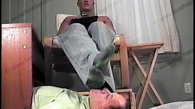 The same scene as #5105, but from two other wonderful camera angles. Two views, one full from front view, one close up from sides of his feet as Apollo gives orders, teases & humiliates his slave who must do much foot service, then sweat sox action & foot licking, toe sucking & licking between the toes, toes in nose, feet constantly licked & kissed, etc.