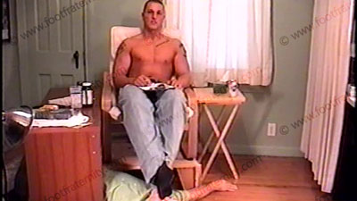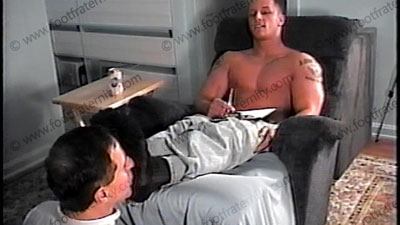 After a hot summer day, the macho, athletic very muscular jock Apollo is wearing torn jeans, gray Puma work out socks & boat shoes as sits in an easy chair with his slave beneath his feet for service of his sweaty socked feet, then bare feet as he responds about what another straight model said who has foot slaves serving his feet. Apollo loves this worship while his sissy slave is there, serving at his fee....... (click video link to see full description)