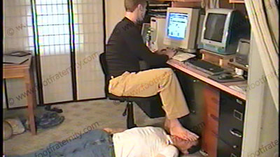 In the dorm room, wearing Khaki slacks, dark socks & penny loafers, his slave is under his chair and at his feet to lick shoes, smell socks and serve bare feet while Taylor uses his slave’s credit card to order things from web sites. He slips part of his foot out of the shoe for the slave to sniff. This humiliates the slave. He steps on the slave's face with bare foot as he spends his money. Two views, on....... (click video link to see full description)