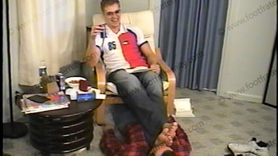 After a volley ball game, Taylor is in his sneakers & white sweat sox, shorts, and "wife-beater" T-shirt to show off his muscular chest. He has his foot slave on the floor, at his feet as he reads the E-Mail from his straight buddy. It’s dominating, humiliating and embarrassing for the sissy to hear what Brian has to say and ask of Taylor while serving Taylor’s feet, socks & shoes. He embarrasses him by....... (click video link to see full description)