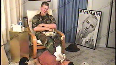Taylor is in his Marine fatigues, boots & dirty, white sweat sox, has slave lick the soles of the boots, worship and serve the socks then do bare foot action. Taylor mocks him as he has to serve the boots, socks and bare feet. He teases and teases, humiliating the slave at his feet. Slave removes boots as he laughs about the scene, making many cocky comments while slave sniffs his sweaty sox. Solid foot/fac....... (click video link to see full description)