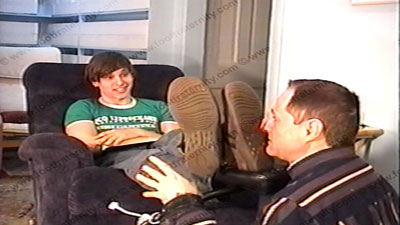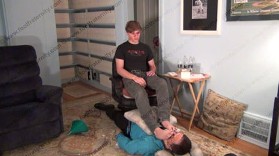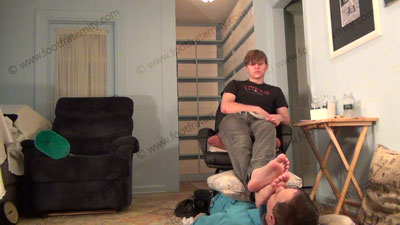 a teenage college guy in jeans, T-shirt, black shoes & black sweaty thick socks relaxes on the easy-boy chair, feet up, with his foot slave beneath his feet for the service of his sweaty socks & bare feet. During worship, he tells what the future holds for his foot slave, and his random thoughts on slaves who need to worship his feet & as he teases the sissy verbally & with his socked and bare feet. He enjo....... (click video link to see full description)