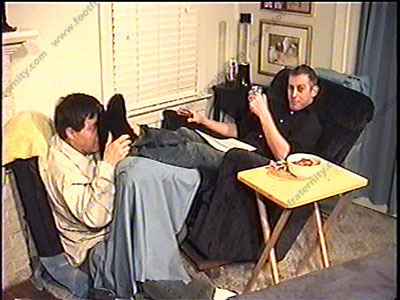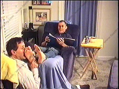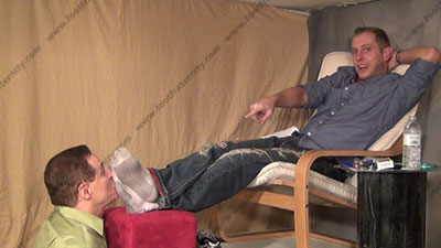 In jeans, dark gold toe sweaty socks, straight Riley has his foot slave at his feet while he reads the manual of “Heterosexual Guy’s Rule Book for Treatment of Slaves”, to his buddy John, about how sissys must serve straight guys. Both guys laugh as slave is at Master Riley’s feet during this film. It’s dominating, humiliating & embarrassing for the slave to hear Riley verbally humiliate him while.......