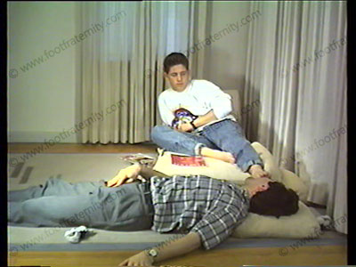 In jeans, dark socks & slip-ons, this cocky guy makes slave beg to sniff socks, lick shoes, & do bare feet. Uses demeaning words to humiliate. Arrogant attitude! Verbal abuse & orders. He walks on slave & massages crotch with foot.