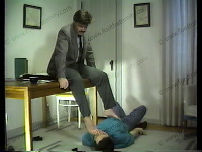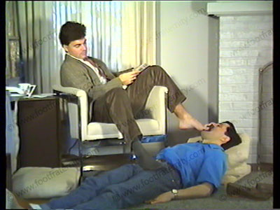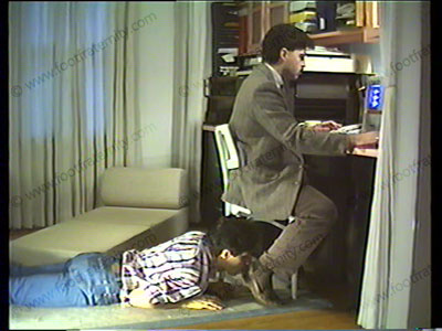 In his suit, tie, loafers & sheer socks, his slave is under chair to lick shoes. He slips part of his foot out of the shoe for the slave to sniff. Verbal nature humiliates the slave. Dangling shoes. Steps on the slave’s face with socked foot. Boss sits back on a lounge while slave removes socks & licks, kisses & worships bare feet.