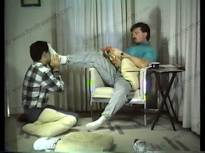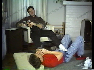 Brad makes Robert lick, kiss & worship his low cut Reeboks, then smelly white sox, bare feet! Close ups. Verbalization. Much foot/body contact with climactic finish.