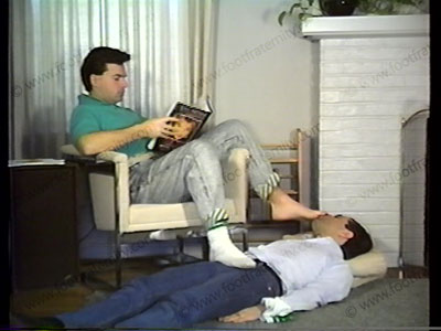 In jeans, Reeboks, sweaty white sox, he sits with slave under the chair & gives many orders for future time. Slave licks sneakers, smells socks & cleans them & licks bare feet & toes. Brad reads pages of orders & rubs his feet in slave’s crotch & face, bringing him off under the sweaty feet! Walks on the slave.