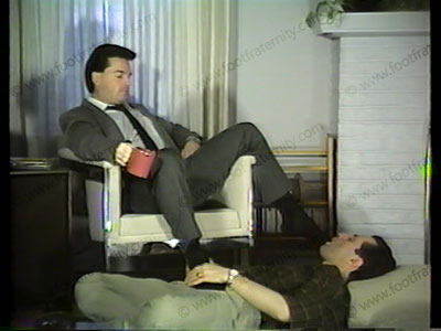 In suit, tie, Italian loafers, dark socks, he is home to take his aggression out on his slave. VERY VERBAL making him lick shoes clean, sniff smelly sox & clean sweaty feet. Lots of foot/body contact as he degrades servant forcing him to get into his feet COMPLETELY.