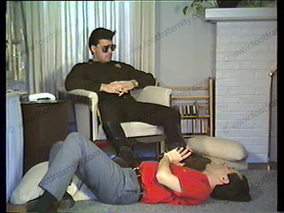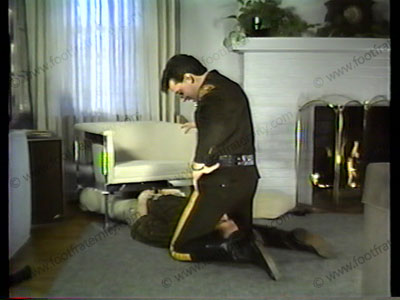 Mirrored sunglasses & uniform, Officer brings guy in, ties him under chair & is VERY VERBAL as he makes him kiss butt, lick black riding boots, smell thin dark socks, & work on bare feet. He calls another cop to tell all. Pulls a gun on the slave to totally humiliate & degrade him as he forces more foot worship. Verbal degradation.