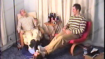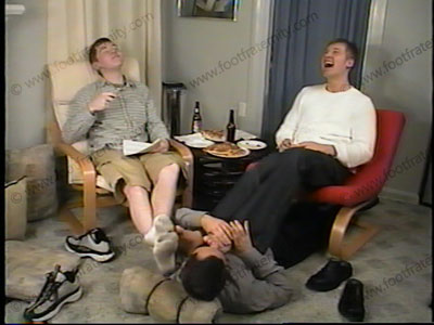 These jock brothers dressed casual in sneakers & sweaty white socks has slave service their sneaks, socks & feet. Fun teasing as they read teasing gay words & try to guess the slave meanings! One wins a prize for the most correct. Much verbal teasing, laughing & four feet in the slave’s face. Two views of this, one full view, one close up. They “party” as they humiliate & wipe their macho feet all ove....... (click video link to see full description)