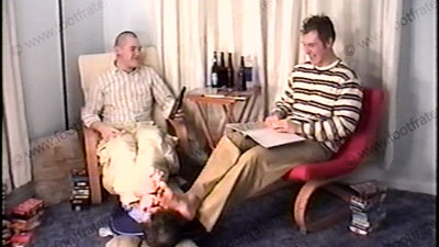 Dressed casual with lace up shoes & clogs, these brothers have fun returning to show sissys where they belong in the Str8 man’s world while tossing back a dozen beers. Nineteen year old Brock (almost skinhead in this) & super college jock Taylor go over the manual & rules of how straight guys treat slaves. Four macho feet in the slave’s face at one time thru the whole scene! Shoes removed to sniff & wor....... (click video link to see full description)